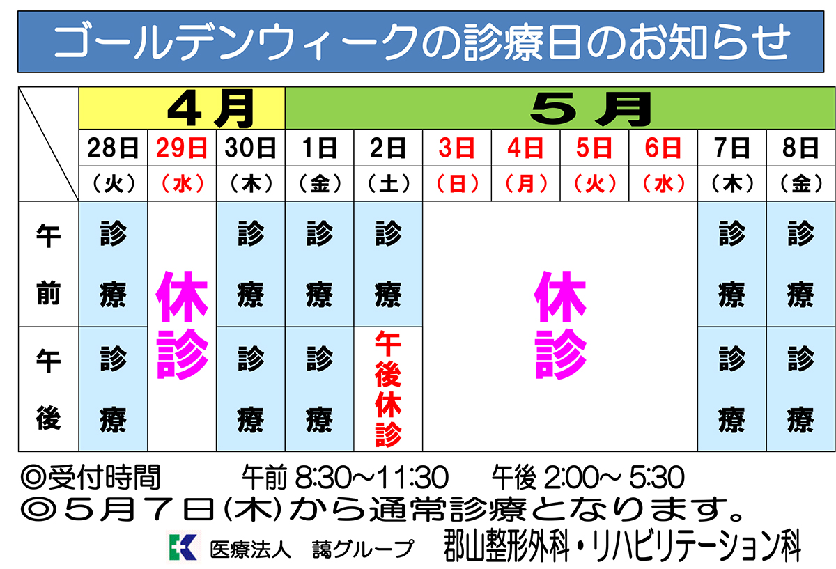 ゴールデンウィークの診療日のお知らせ